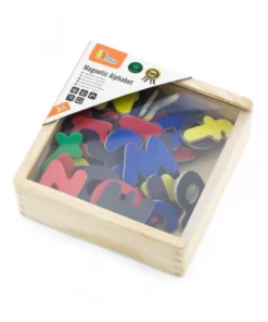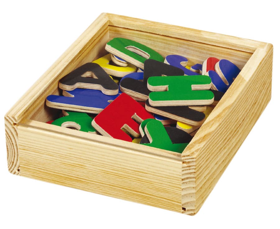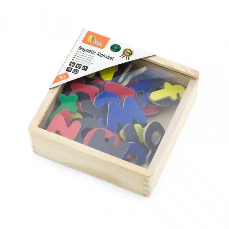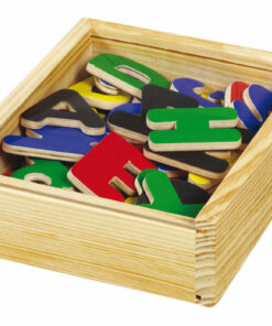 - 52 de litere magnetice – 26 litere mici și 26 majuscule într-o cutie de lemn cu capac transparent.